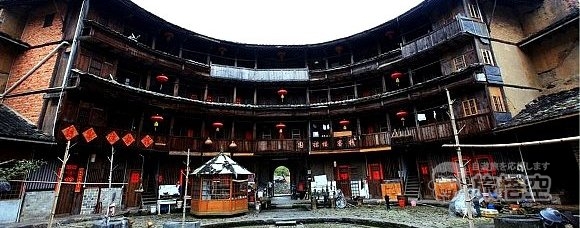南靖県の田螺村にある、世界遺産に登録された福建土楼の1つ。この土楼群は、山の中腹の海抜800メートル近くの窪地にあり、正方形の土楼を、3つの円楼と1つの楕円楼が取り囲むように建てられています。