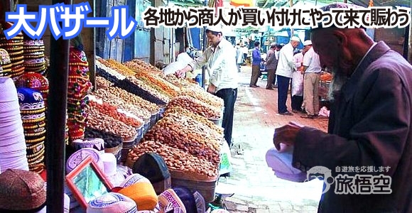 カシュガル最大の見所で、工芸品、食品、漢方薬から機械まで何でもありの市場です。屋内だけでなく、露店も多く、現地の人の呼び込みの声が飛び交う市場です。