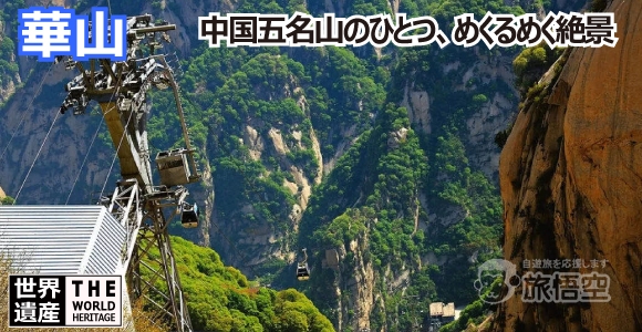世界遺産で、中国五名山のひとつに数えられる道教の聖地。華山は花崗岩の岩山で、主峰の落雁峰(南峰)は標高2154m、蓮花峰(西峰)は標高2080m、朝陽峰(東峰)は標高2100m、北峰は標高1614メートル、中峰は標高2037mで構成されています。北峰は黄河を俯瞰しており、南は榛嶺山脈に連なっています。急峻な山々が連なるその風景はまさに仙境そのものです。