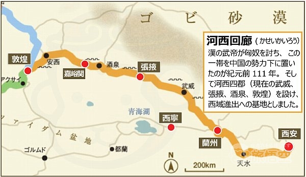 日本人にとってもシルクロードの起点として馴染みのある町・西安から始まる河西回廊は、甘粛省の黄河以西の地を指し、南の祁連山脈と北の内蒙古の砂漠の間の回廊城の地帯を指し、西域へ続く帯状の道。漢代以前は匈奴などの遊牧諸民族なども暮らしていましたが、漢の武帝が匈奴を討ち、この一帯を中国の勢力下に置いたのが紀元前111年。そして河西四郡(現在の武威、張掖、酒泉、敦煌)を設け、西域進出への基地としました。その後、戦乱や自然災害などを町も変化しつづけ、現在に至ります。