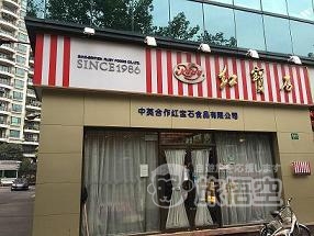 中国企業のケーキ屋さん「紅宝石」。上海に何店舗かあり、一番の人気はショートケーキ。今回は新華路をご紹介。赤と白のストライプの看板が目印。1986年から営業されているそうです。