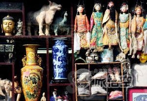 東西に延びる瑠璃廠文化街は、南新華街と交差する辺りが中心地で大型の書店「中国書店」があります。海外の研究者がよく立ち寄る書店で人文科学系の専門書が多く一部古書も扱っています。ここから東側は瑠璃廠東街と呼ばれ延寿街まで続き書画を商う老舗が並びます。西側は瑠璃廠西街で柳巷まで延び、書店が軒を連ねてます。書画、骨董については巧妙なレプリカが多いがごく稀に掘り出し物もあります。