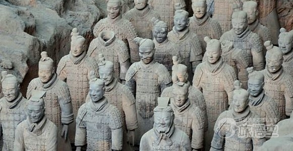 1974年 秦始皇陵の東1.5kmの所で井戸を掘る際に偶然発見された中国十大名所の1つで世界人類文化遺産。発見順序で1、2、3号坑と名づけられ,総面積は22780㎡、1号坑には,約6000体の戦袍武士俑が実戦軍陣で配列、2号坑からは,1000余体の陶俑及び500体の車馬が出土、3号坑には,馬俑が4体、馬車1台及び568体の陶俑がある。